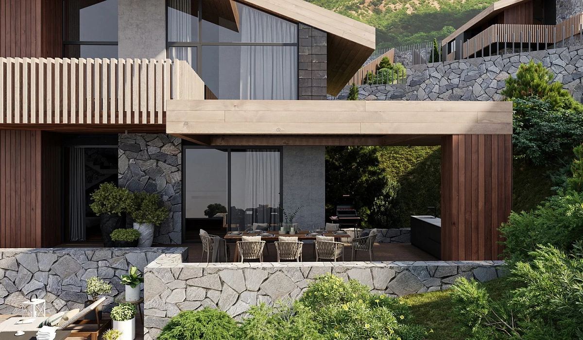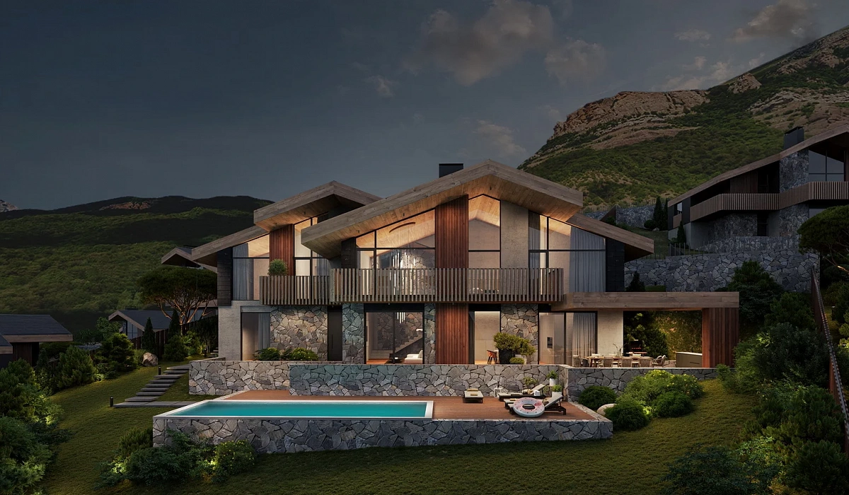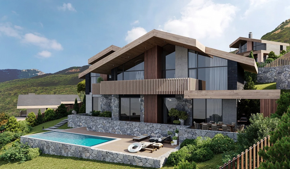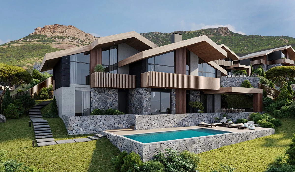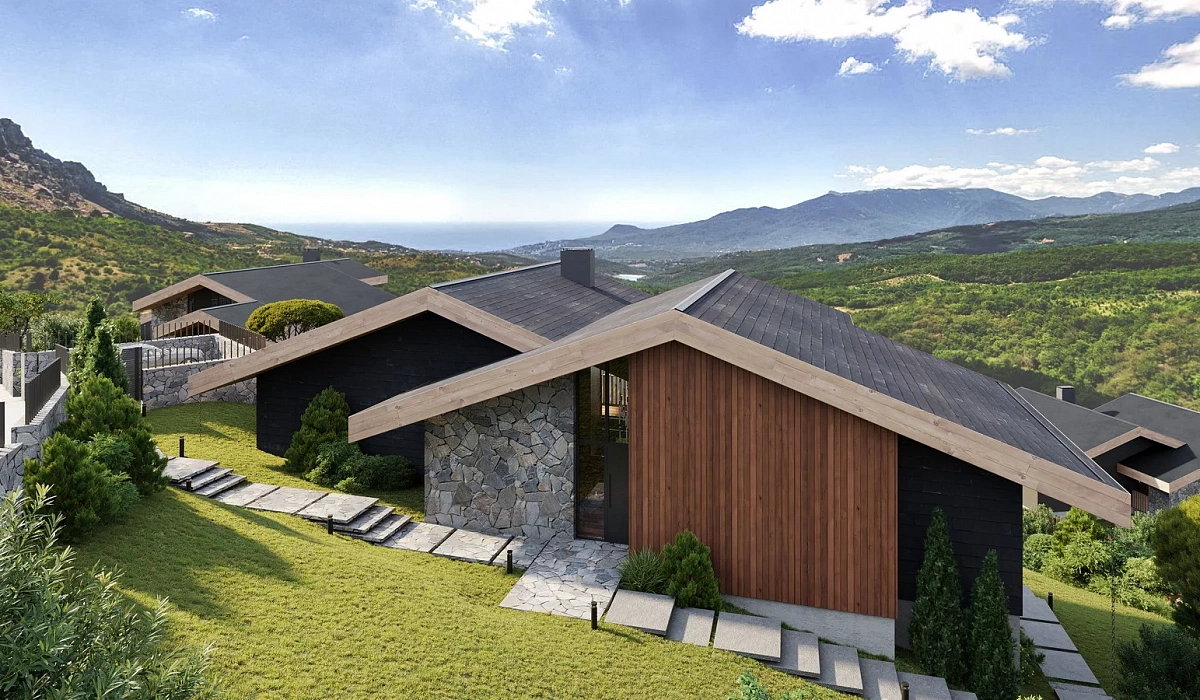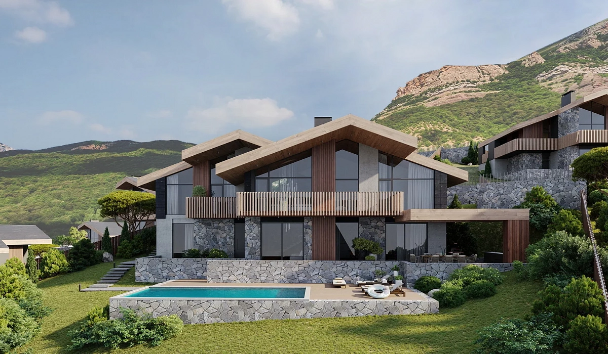 Коттеджный посёлок в стиле Chalet с закрытой территорией в тихой уединенной локации с видом на море и горы.