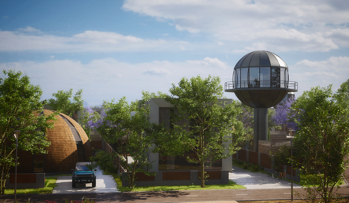 Посёлок построен на месте известного крымского «окна в космос», где готовилась к испытаниям первая в мире группа космонавтов во главе с Юрием Гагариным, и вдохновлён космическими мотивами.